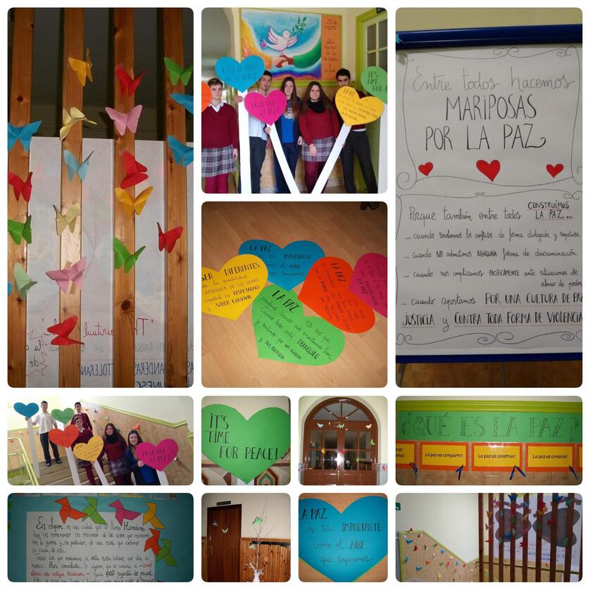 En esta ocasión, nuestro colegio ha recordado esta importante fecha decorando los pasillos con "Mariposas por la paz". Además, se han puesto en las puertas de las clases unos corazones con frases alusivas al tema y en los pasillos, murales recordando a todos los alumnos qué significa esta jornada, y cómo construir la paz entre todos.